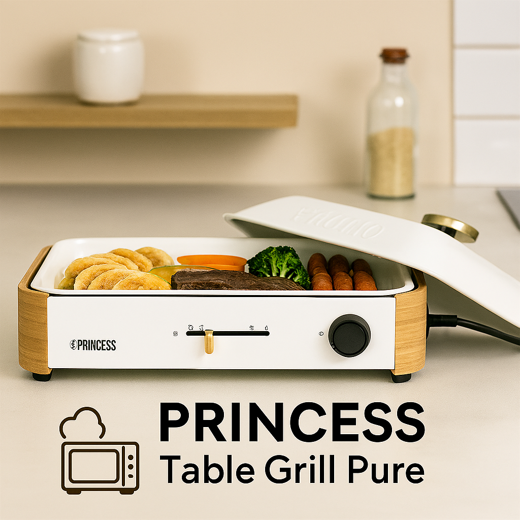 オランダの家電ブランド、PRINCESS(プリンセス)が手がける**「Table Grill Pure」**は、これまでのホットプレートの概念を覆した製品です。天然の竹(バンブー)素材と、美しい白いセラミックプレートを組み合わせたデザインは、まるで高級なテーブルウェア。特に、油なしで調理できるヘルシー志向と、煙やニオイを抑える機能が、高い評価を得ています。