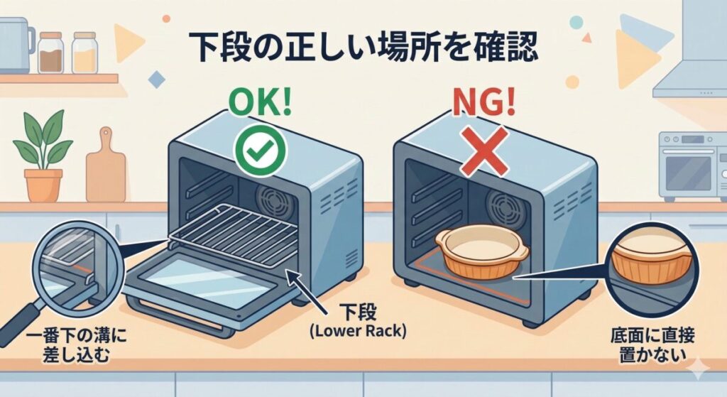 オーブンレンジの「下段」とは、単なる場所の指定ではなく、「じっくり熱を通す」「高さを確保する」という明確な役割を持ったスペースです。