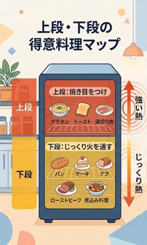 - 上段:短時間で焼き目をつけたいもの(グラタン、トースト、薄い肉料理)。