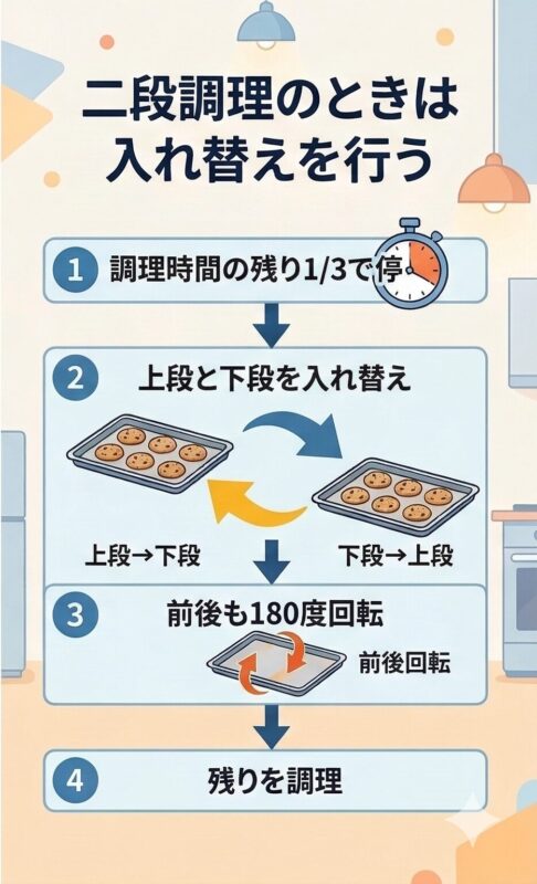 クッキーなどを二段で焼く場合、どうしても上段と下段で熱の入り方が変わります。調理時間の残り3分の1程度になったところで、上段と下段の角皿を素早く入れ替えると、全体が均一に美しく焼き上がります。