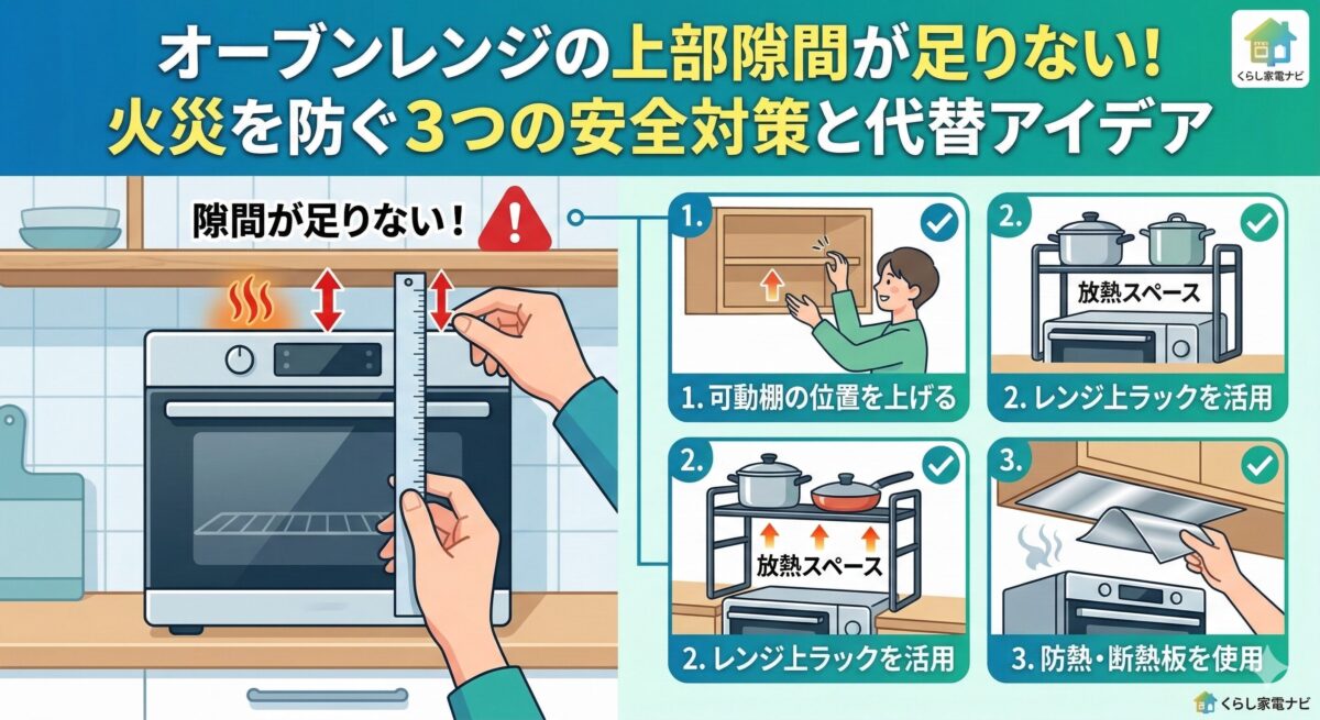 「新しいオーブンレンジを買ったけれど、棚との隙間が全然ない…」「上が熱くなるけど、このまま使い続けても大丈夫?」と不安に感じていませんか?