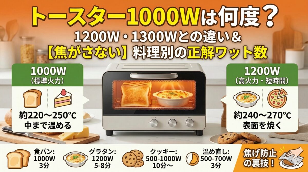 この記事では、1000W・1200W・1300Wの温度目安といった基本情報はもちろん、検索結果だけでは分からない「グラタンやクッキーなど料理別の正解ワット数と時間」や、「もう絶対に焦がさないための裏ワザ」まで徹底解説します。