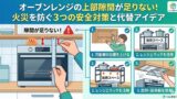 (具体例) カタログに「壁ピタ設置対応」とあっても、説明書を読むと「上面は10cm以上空けてください」と記載されています。もし上面にスペースがない棚に無理やり押し込むと、排気熱がこもってエラー停止したり、最悪の場合は発火のリスクがあります。購入前に、必ず上面に必要な寸法を確認しましょう。万が一、現在の棚で寸法が足りない場合は、オーブンレンジ上部の隙間が足りない時の対策も併せて確認しておきましょう。